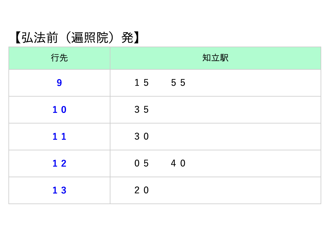 御命日の臨時バスダイヤ改正のおしらせ 2022年1月22日 名鉄知立駅と弘法前(遍照院)を結ぶ臨時バスは、令和4年から「知立駅~弘法前」のみの運行となり「一ツ木~一里山~知立駅」は運行しなくなりますのでご注意ください。 時刻表は画像を参照ください。